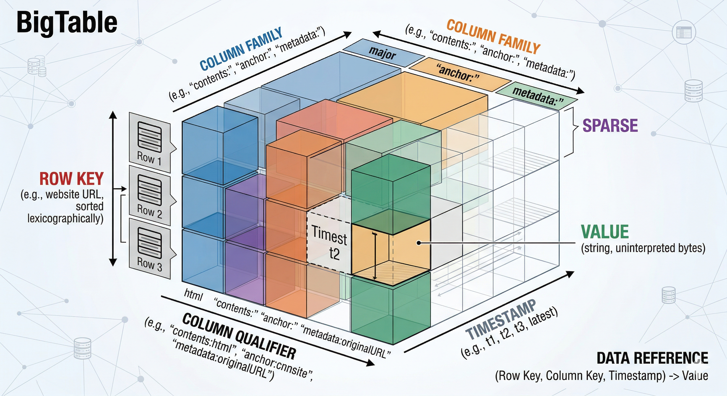 BigTable은 과감하게 복잡한 관계를 포기하고, 본질적으로는 (Row, Column, Timestamp)라는 세 가지 키로 값을 찾는 거대한 Sorted Map 구조를 선택했습니다. 데이터는 Row Key를 기준으로 사전순 정렬되어 저장되는데, 덕분에 특정 범위의 데이터를 읽는 ‘Range Scan’ 성능이 압도적입니다. 이는 현대 NoSQL의 표준 모델이 되었습니다.