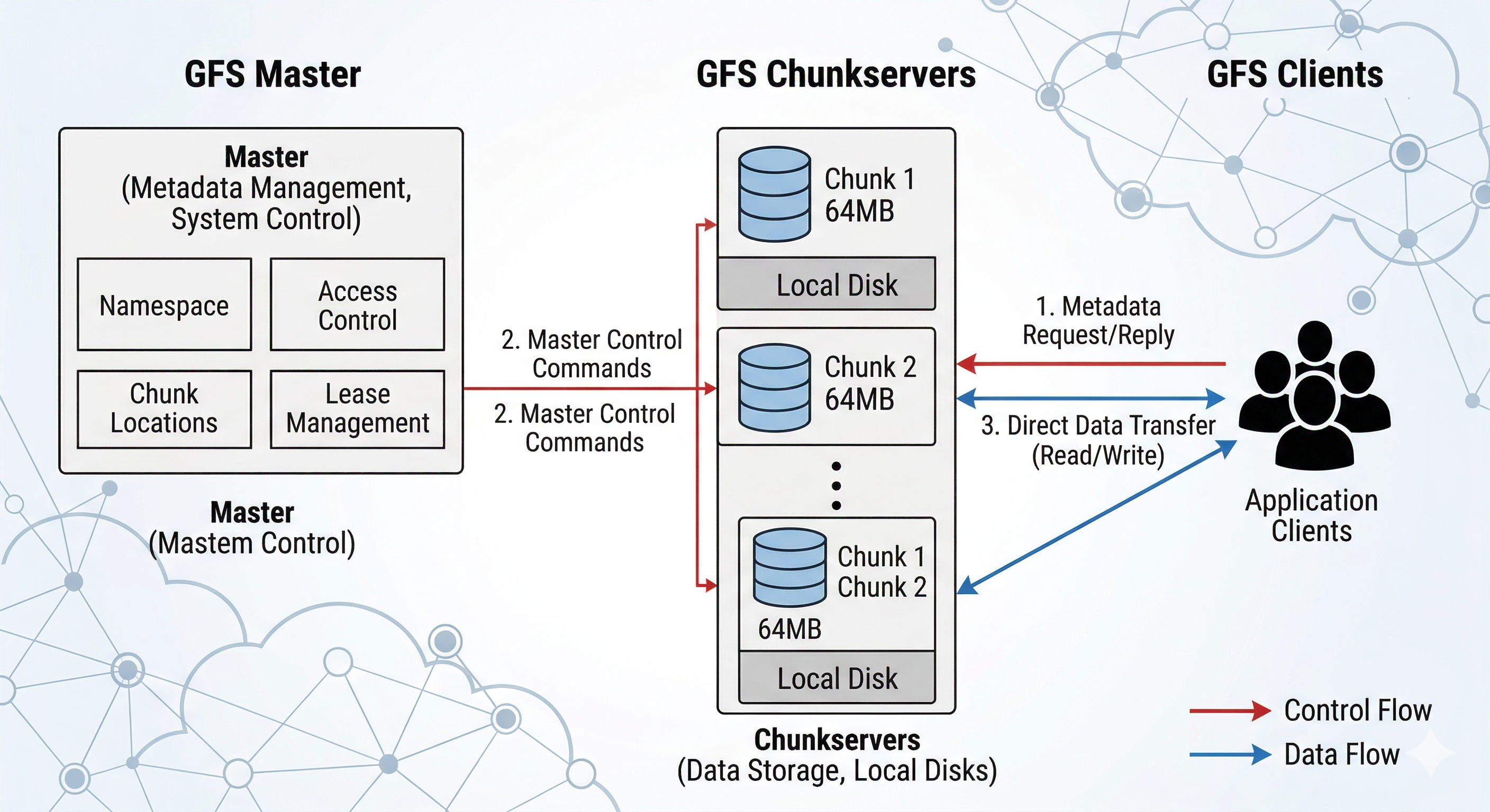 GFS는 이를 위해 제어부(Control Plane)와 데이터부(Data Plane)를 완전히 분리했습니다. 클라이언트는 마스터에게 “내가 찾는 파일이 어디 있니?”라고 위치만 물어본 뒤, 실제 수 기가바이트의 데이터 전송은 해당 Chunkserver와 직접 수행합니다. 마스터는 길 안내만 해줄 뿐, 무거운 짐은 옮기지 않는 구조를 통해 병목 현상을 혁신적으로 제거했습니다.