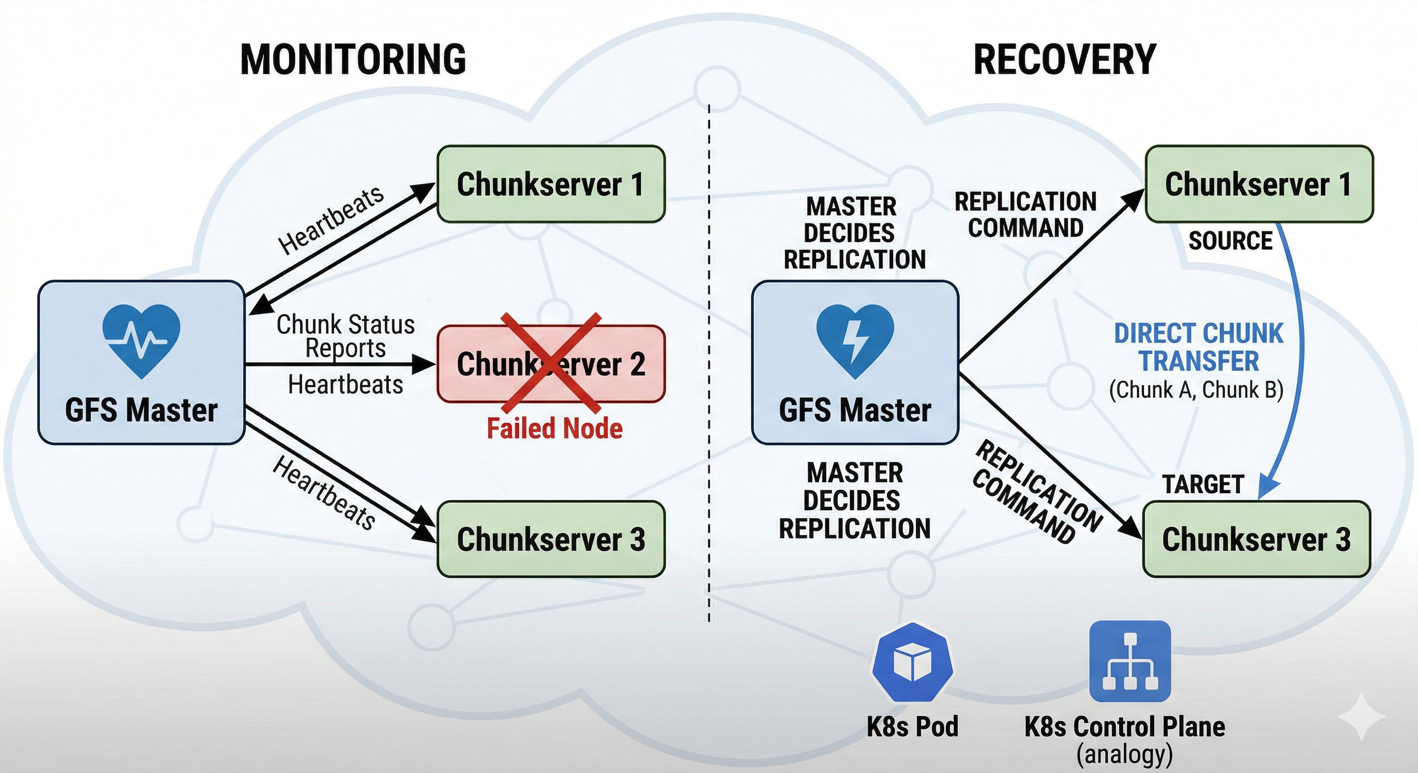 구글은 이를 해결하기 위해 자동 복구 시스템을 핵심으로 설계했습니다. 중앙의 Master는 수많은 Chunkserver들과 끊임없이 통신(Heartbeat)하며 상태를 체크합니다. 만약 특정 서버가 응답하지 않으면, 그 서버가 가졌던 데이터를 즉시 다른 서버에 복제하도록 지시합니다. 마치 현대의 Kubernetes가 Pod의 상태를 감시하며 셀프 힐링을 수행하는 것과 같은 원리입니다.